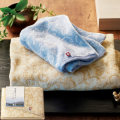 蔦(つた)と睡蓮(すいれん)をモチーフにした和更紗模様を、今治の職人ならではの技で細やかに表現しています。タオルの端のヘム部分には、しまなみの穏やかな海を表した波模様を、艶やかな糸で織り上げ、細部までこだわった美しいタオルに仕上げました。木箱に詰めて、感謝を込めた贈り物として最適な逸品です。