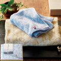 蔦(つた)と睡蓮(すいれん)をモチーフにした和更紗模様を、今治の職人ならではの技で細やかに表現しています。タオルの端のヘム部分には、しまなみの穏やかな海を表した波模様を、艶やかな糸で織り上げ、細部までこだわった美しいタオルに仕上げました。木箱に詰めて、感謝を込めた贈り物として最適な逸品です。