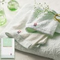 タオルにふんわり花咲くカスミソウの花言葉は清らかな心・幸福・永遠の愛・そして「感謝」。可憐なカスミソウに心からの感謝をこめて。タオルのヘムに輝くシルバーのラメが、さりげない上品さを演出してくれます。
