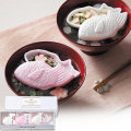2つの味が楽しめる紅白鯛のお吸い物最中。鯛は長寿の象徴と言われ、縁起が良いとされています。