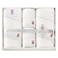 お肌になじみ、水分をしっかり吸収してくれるのでとても使いやすく贈り物に最適です。金糸・銀糸を使うことでさりげない豪華さと気品をそなえています。タオルの名産地「今治」から純白のタオルに気品をのせて。
