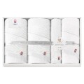 お肌になじみ、水分をしっかり吸収してくれるのでとても使いやすく贈り物に最適です。金糸・銀糸を使うことでさりげない豪華さと気品をそなえています。タオルの名産地「今治」から純白のタオルに気品をのせて。