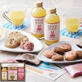 国産りんごを使用した、濃縮還元果汁100%のほどよい酸味でスッキリとした味わいのりんごジュースに、ほろほろと口どけの良いココアクッキー・イチゴクッキーや、マカダミアナッツとぺカンナッツ、チョコチップをたっぷり入れて、ざっくりとした食感に焼き上げたざっくりクッキーなどを詰合せました。