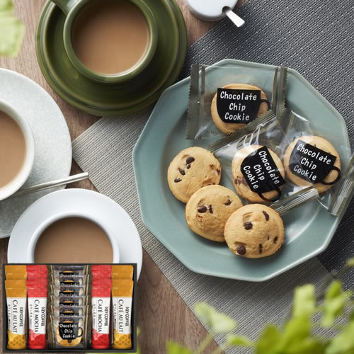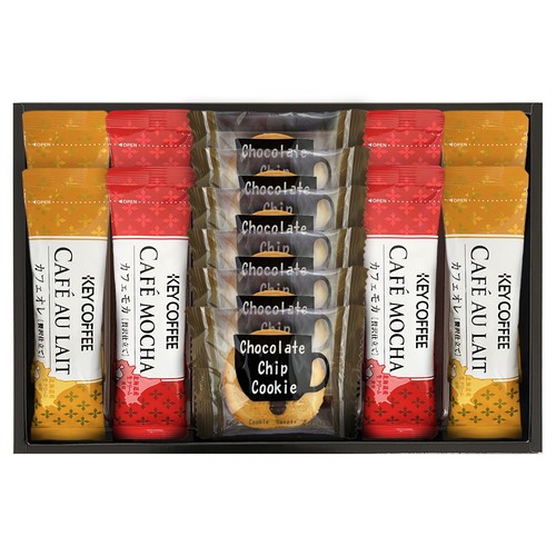 【内容】チョコチップクッキー×6、キーコーヒーカフェモカスティック(7.8g)・キーコーヒーカフェオレスティック(7g)×各4